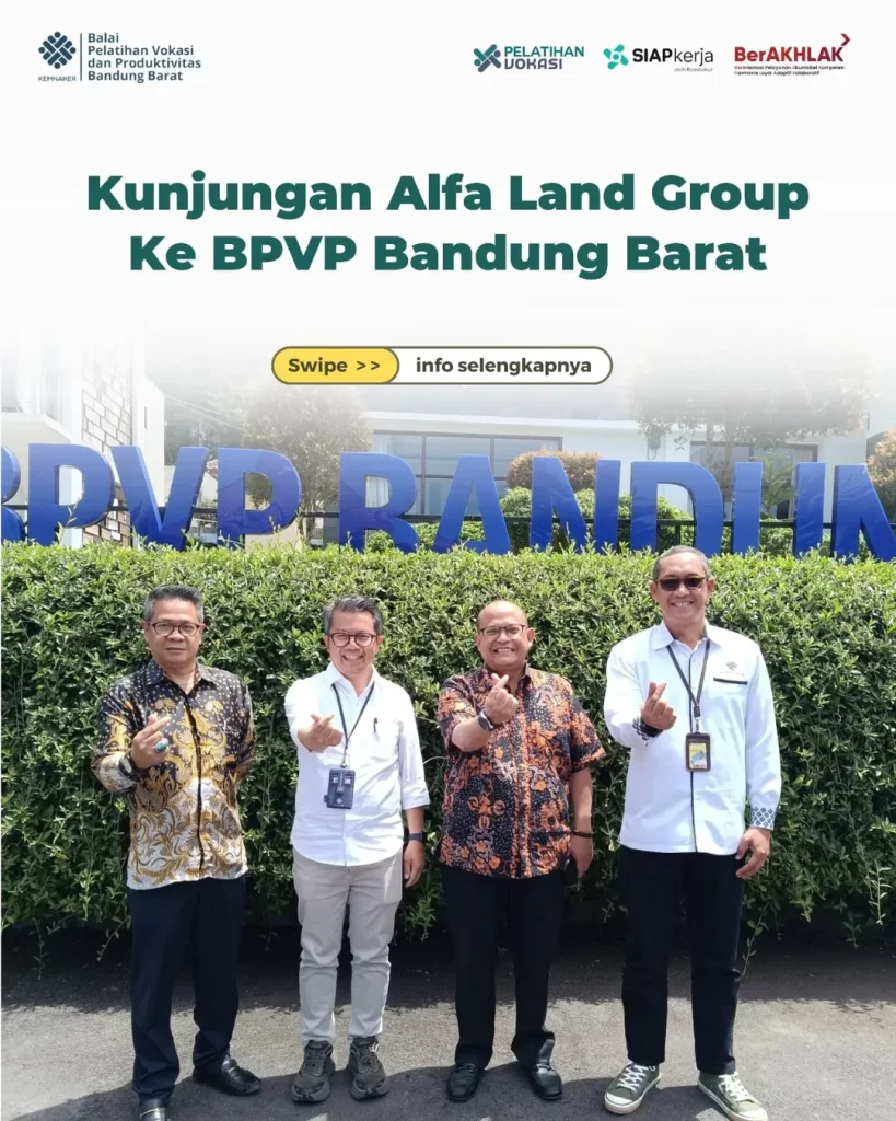 Lembang, 3 September 2025 – Balai Pelatihan Vokasi dan Produktivitas (BPVP) Bandung Barat menerima kunjungan dari Alfa Land Group. Alfa Land merupakan unit usaha Alfa Corp yang bergerak di bidang properti, termasuk hotel dan restoran. Kunjungan ini menjadi tindak lanjut dari penandatanganan nota kesepahaman antara Alfa Corp dan Ditjen Binalavotas Kementerian Ketenagakerjaan RI.