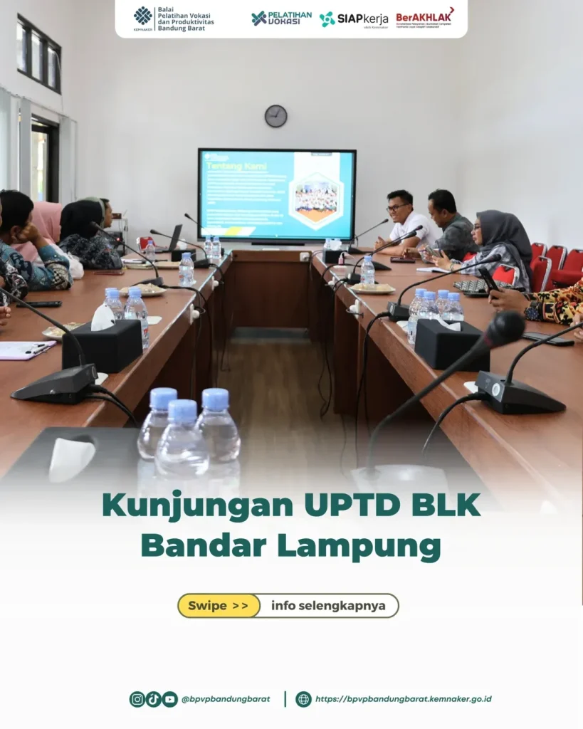 BPVP Bandung Barat menerima kunjungan kerja dan silaturahmi dari UPTD Bandar Lampung pada 19 Desember 2025. Kunjungan ini menjadi momentum penting untuk mempererat hubungan kelembagaan sekaligus memperkuat sinergi antarunit pelatihan vokasi di bawah Kementerian Ketenagakerjaan. Pertemuan ini juga menjadi wadah untuk membangun komunikasi yang lebih terbuka dan produktif. Dengan adanya kunjungan ini, kedua pihak dapat saling memahami kebutuhan masing-masing. Hal tersebut akan memperkuat kolaborasi dalam menghadapi tantangan dunia kerja yang terus berubah. Kegiatan ini juga menunjukkan komitmen bersama dalam meningkatkan kualitas layanan pelatihan vokasi.