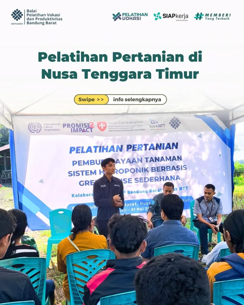 Balai Pelatihan Vokasi dan Produktivitas (BPVP) Bandung Barat terus berkomitmen menjadi motor penggerak vokasi di Indonesia. Melalui sinergi bersama International Labour Organization (ILO) dan Bank NTT, BPVP Bandung Barat menghadirkan pelatihan bertajuk “Pembudidayaan Tanaman Sistem Hidroponik Berbasis Greenhouse Sederhana” di Waikabubak, Kabupaten Sumba Barat.