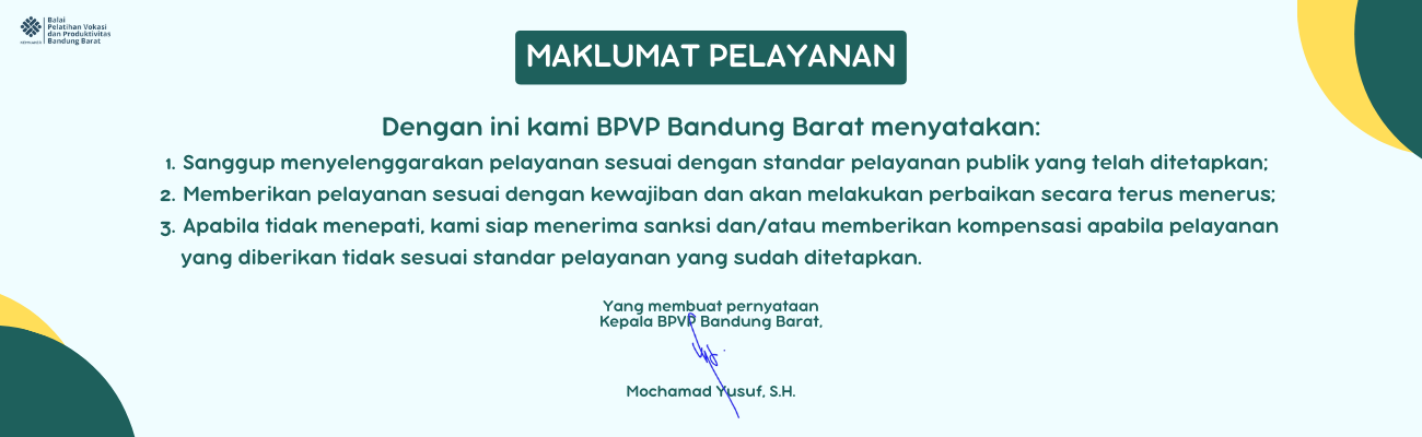 Dengan izin Allah SWT pembuatan buku Standar Pelayanan Publik pada Balai Pelatihan Vokasi dan Produktivitas Bandung Barat telah selesai dilaksanakan.