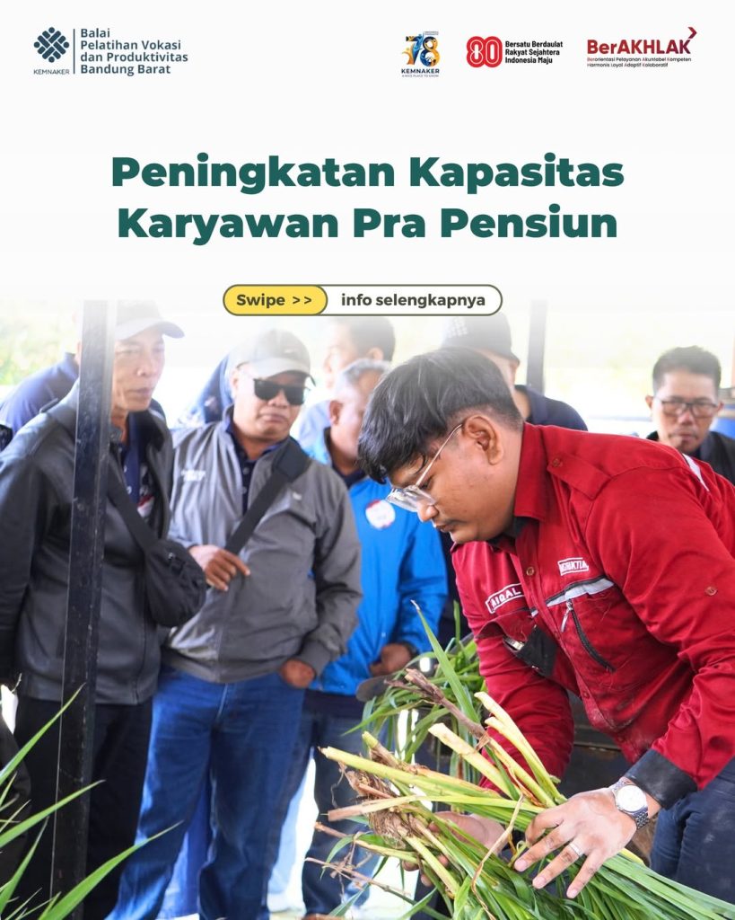 Kamis, 7 Agustus 2025 โ BPVP Bandung Barat bekerja sama dengan Kubik Leadership menggelar pelatihan agroindustri peternakan. Kegiatan ini diikuti oleh 46 karyawan pra pensiun PT Pamapersada Nusantara. Pelatihan berlangsung di BPVP Bandung Barat dengan suasana penuh semangat dan antusiasme peserta.