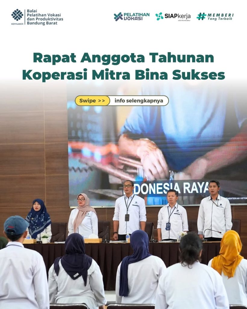 Bandung Barat – Koperasi Mitra Bina Sukses menggelar Rapat Tahunan Anggota (RAT) Tahun 2024 di Aula Balai Pelatihan Vokasi dan Produktivitas (BPVP) Bandung Barat, dengan dihadiri oleh 48 anggota, memenuhi syarat quorum. Kegiatan ini dibuka secara resmi oleh Kepala BPVP Bandung Barat, yang menekankan pentingnya koperasi sebagai pilar penguatan ekonomi berbasis kebersamaan dan kesejahteraan anggota.